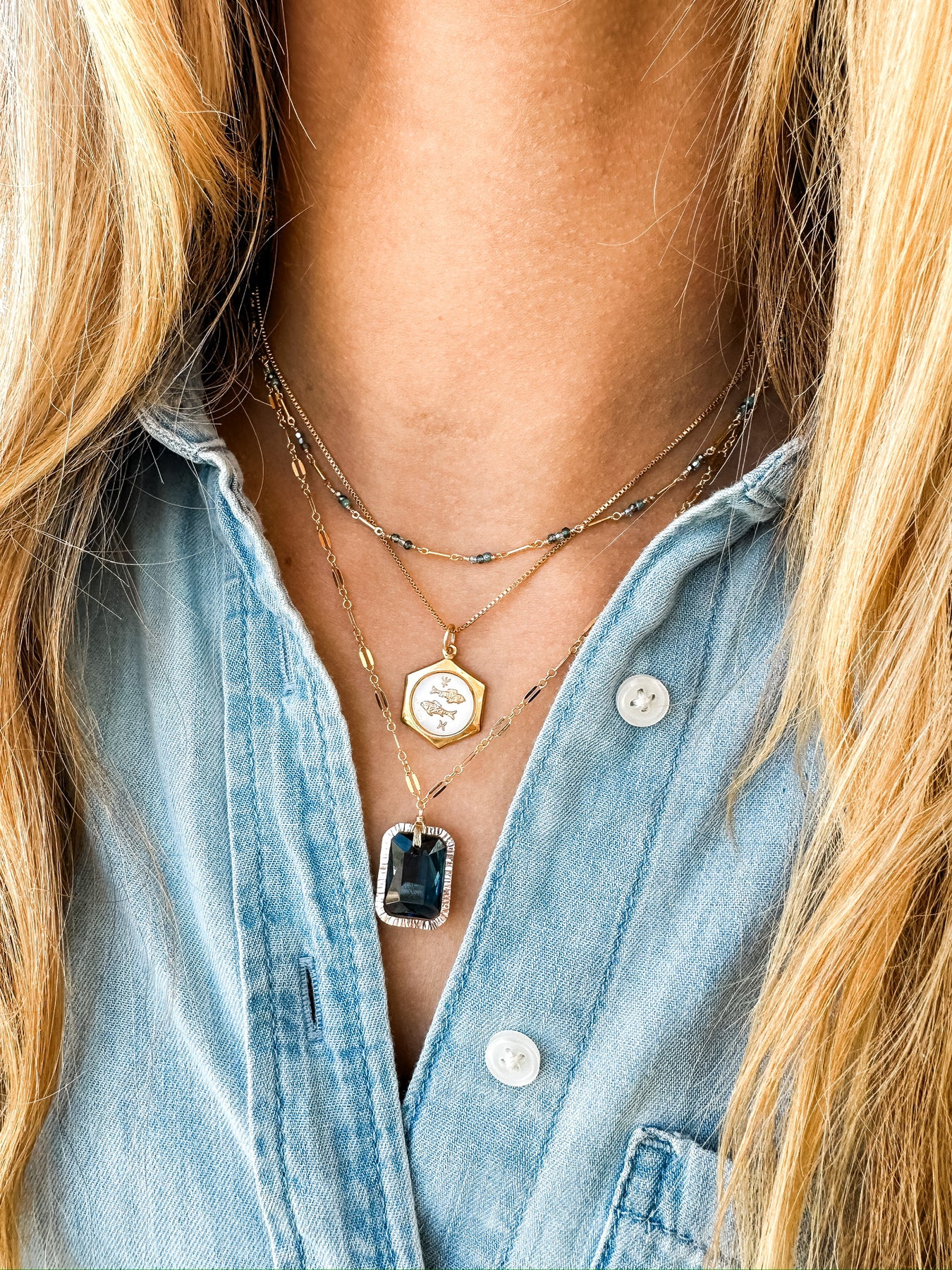 Add a pop of sparkle with this Deep Blue Crystal Pendant Necklace. Featuring a dazzling faceted crystal set in 14k gold fill, and clean lines, all handmade with care in a Los Angeles studio. Ready to brighten any outfit!