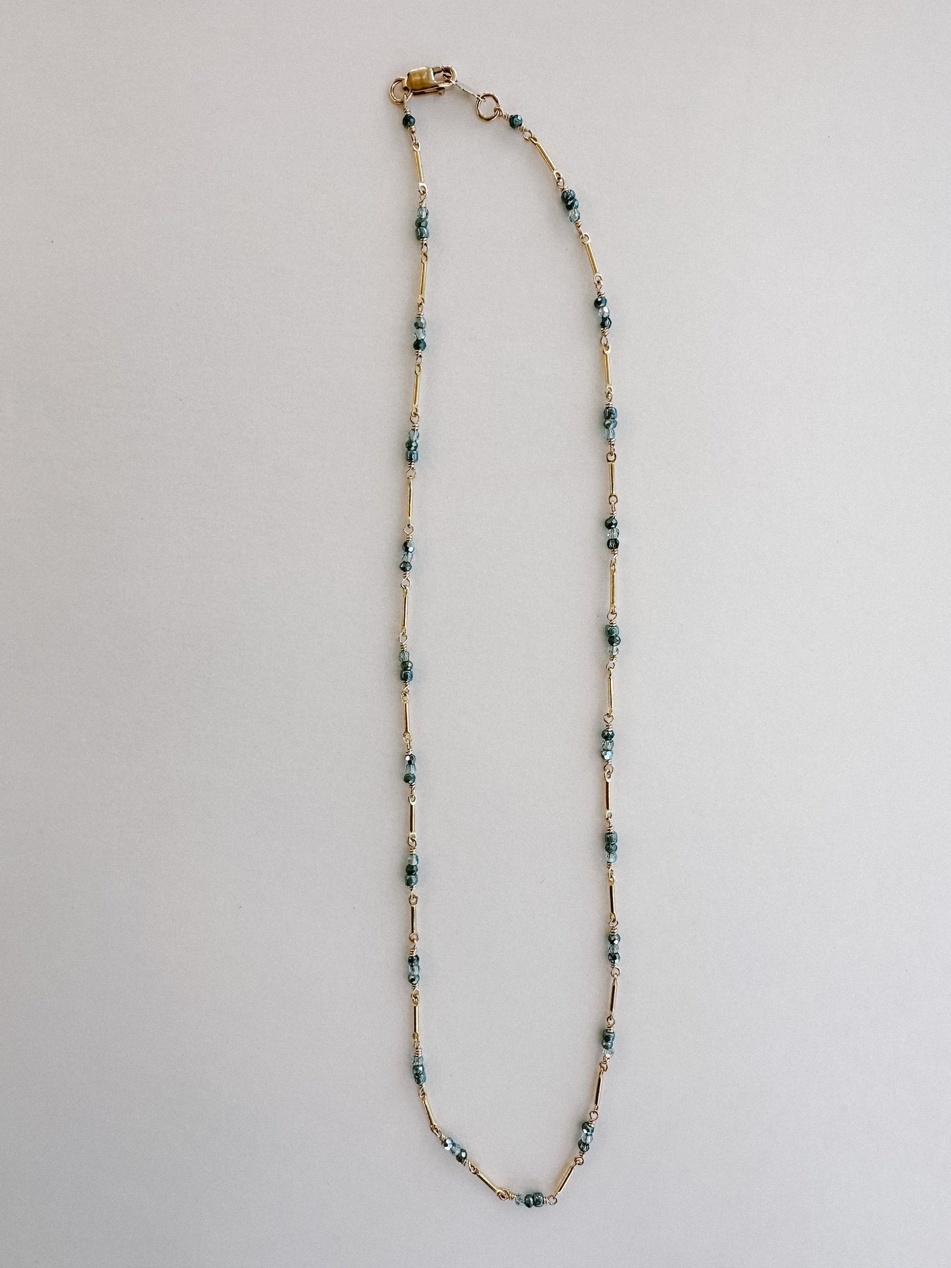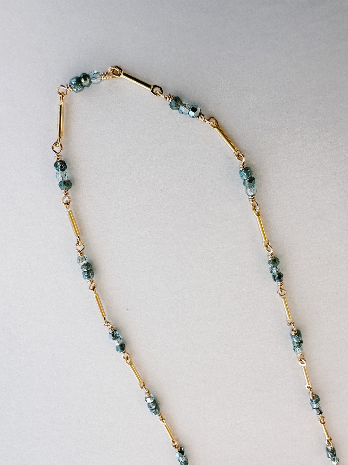 The Indigo Mix Crystal Necklace pairs tiny bead sections with elongated 14k gold-filled links for an effortless elegance. Handmade in our Los Angeles studio, it’s a versatile piece that adds a touch of sparkle and gold to any outfit. Perfect for layering or wearing solo!